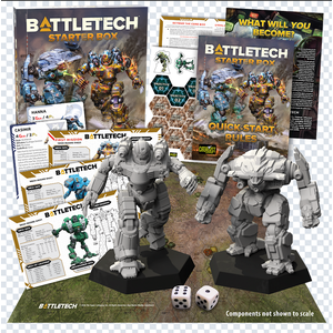 The Starter Box builds off of the success of the Beginner Box and Essentials, but ups the ante. As a starting point for new players, it eases novice MechWarriors into the BattleTech game as smoothly as ever. But now, the reverse of each half-page record sheet offers a taste of the exciting equipment and rules that the full BattleTech game brings to your table. The box includes two fan-favorite, ilClan-era BattleMechs: the dogged Hammerhead and the brutal Kontio!
