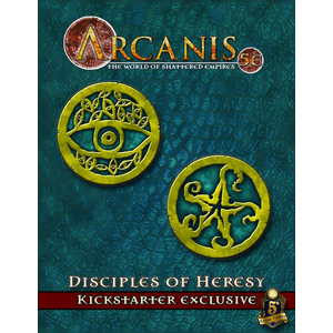 The Disciples of Heresy is a 72-page, full-color book that details two of the most infamous cults on Arcanis: The Cult of the Thousand Eyed Man and the Cult of Tzizhet. The book consists of an in-depth description of the Cults, including their goals, hierarchy, unique spells, magic items, and more! It also includes two adventures, "For I See Naught but Ruin and Woe" and "The Dagger of Rhekhak" where the Heroes face off against the cults' insidious machinations.