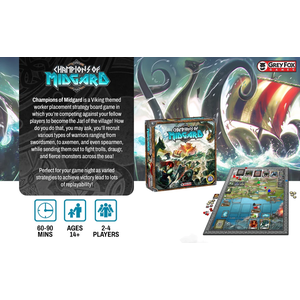Spelet innehåller dessa kort:Champions of Midgard är ett medeltungt vikingatema-spel med worker placement och tärningsslag, där spelarna tar rollen som ledare för varsin vikingaklan. De har rest till en utsatt vikingahamnstad för att hjälpa till att försvara den mot hotet från troll, draugar och andra mytologiska nordiska vidunder. Genom att besegra dessa episka varelser vinner spelarna ära och gudarnas gunst. När spelet är slut får spelaren med mest ära titeln Jarl och erkänns som en sann mästare av Midgård!