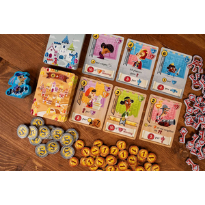 Each player will spend coins to draft 9 cards from 2 open markets on the table (the lower and upper city), creating along the game a 3x3 square of people interacting with each other to trigger instant effects and end-of-game bonuses.
