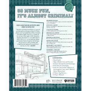Innehåll: Värdguide, karta, 8 inbjudningar med kuvert, 8 kuvertklistermärken, 8 hemliga ledtrådskort, 1 utredningskort, 1 meny-kort, 8 namnskyltar och 8 spelarmanualer.