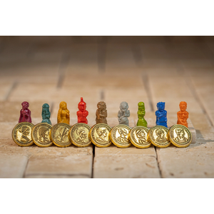I deluxutgåvan ingår följande komponentuppgraderingar: metallmynt, tempel i metall, karaktärmeeples i trä, kortlåda i hårdplast. graverad tärning och linnépåse.