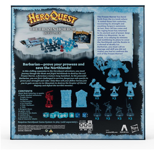 In HeroQuest: The Frozen Horror, an expansion for the HeroQuest Game System, you must journey through the bleak and frigid Northlands to destroy the evil frozen horror, a ferocious creature long banished. As the powerful barbarian, you are first challenged to survive dangerous solo quests to prove your strength and valor. Only then will your fellow heroes join you to gain access to the ice mountain to destroy the Scepter of Glacial Majesty and defeat the terrible monster.