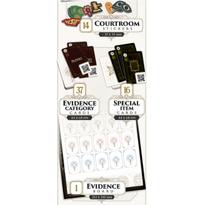Innehåller 40 karaktärskort (58x88 mm), 16 platskort, spelbräde, 14 spelbrädesmarkörer, 37 beviskort (44x68 mm), 16 föremålskort (44x68 mm), bevisbräde, regelbok på engelska och 4 spelscenarion (90-120 minuter per scenario)..