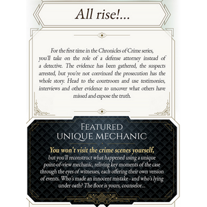 Du är inte längre detektiven som jagar gärningsmannen. Du försvarar den misstänkte. För första gången i Chronicles of Crime-serien kliver du in i rollen som försvarsadvokat.