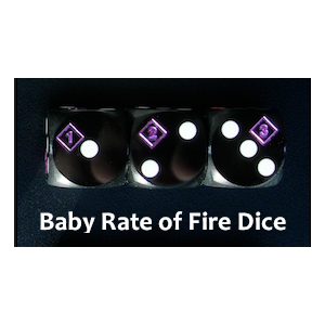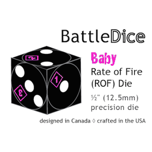 These black ”ROF” dice are intended to be paired with our 12,5 mm white ”nationality” dice. Our Baby ROF dice retain pips on all faces because the main purpose of these dies is to replace the color dice normally used when rolling two dice. The foil designs are meant to prompt players to check for possible ROF during play. Otherwise, the black die functions as a standard ”color” die.