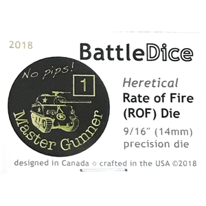 The Heretical ROF die is rolled as a third die. Its sole purpose is to determine ROF. To avoid confusion, the die has no pips. (Early production runs retained white pips on some faces.)