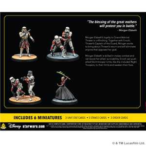 Morgan Elsbeth’s loyalty to Grand Admiral Thrawn is unflinching. Together with Enoch, Thrawn’s Captain of the Guard, Morgan works to bring about Thrawn’s return and will eliminate anyone that opposes her goal. Morgan Elsbeth is skilled in melee combat and can boost her allies’ survivability. Enoch can buff Imperial Supporting Units, like the included Night Troopers, making them even more effective in combat.