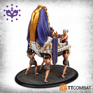 The Opulent Noble demands complete obedience from his followers, often shouting out commands, bits of half-chewed food, and spittle drooling from his mouth. It is little surprise that the Opulent Noble has grown so enormous that he is carried upon a palanquin, held up by four servants. Sat on the finest padded chair atop his palanquin, bedecked in the finest silks and golden cutlery, this noble travels throughout Venice, sampling any and all foods that take his fancy