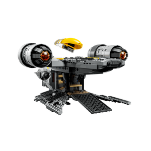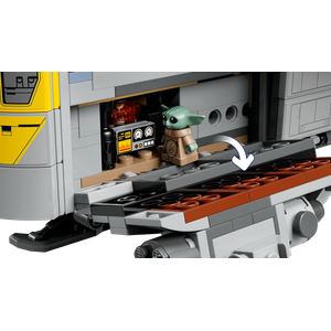 Funktioner och inre utrymmen Rymdskeppet är utformat för att vara lättåtkomligt under lek. Genom att lyfta av cockpitens huv kan två minifigurer och Grogu placeras vid kontrollerna. Sidopanelerna är öppningsbara för att ge tillgång till motorn och lastutrymmet, och skeppet är utrustat med fällbara landningsramper. För actionfyllda scener har skeppet två integrerade knoppkanoner. I setet ingår även en klossbyggd Sentry E-Web-kanon som tillhör stormtrupperna.