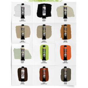 AK gouache paints are a combination of opaque pigments mixed with a water-based binder. They create vibrant, saturated colors that are great for making matt opaque layers. AK gouache paints can be applied over conventional acrylics, enamels, and oil paints along with plastic, paper, cardboard, and other types of media. These properties make AK gouache paints perfect for the application of matt rust, earth, and other weathering tones.