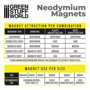 De passar särskilt bra för större figurer och metallbaser, men kan även användas för kreativa lösningar som utbytbara vapen, armar eller delar på miniatyrer. Dessa magneter erbjuder en mycket stark attraktionskraft och är idealiska när det krävs extra kraft i små format.