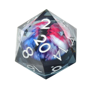 Tärning med flytande kärna i resin: Tillverkad av högkvalitativ resin, denna d20-tärning är handgjuten och har vassa kanter. Inuti finns en flytande kärna med gnistrande partiklar.