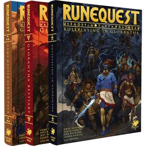 This set of core products for RuneQuest: Roleplaying in Glorantha contains everything gamemasters and players need for incredible adventures in the world of Glorantha. This beautiful collector s slipcase set contains the core rule book for RuneQuest: Roleplaying in Glorantha, the Glorantha Bestiary, and the Gamemaster s Screen Pack. With these three products in this deluxe package, the gamemaster has everything required to run RuneQuest games set in Glorantha.