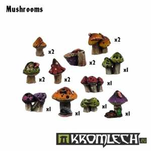This pack contains 16 resin mushrooms. Mushrooms vary in size (6mm - 15mm) but fit most popular wargaming bases. They may be also useful for terrain - especially woods.