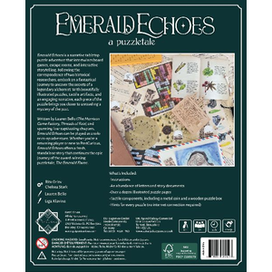 Emerald Echoes är ett narrativt pusseläventyr som kombinerar vackert illustrerade gåtor med taktila artefakter. Genom ögonen på en historisk forskare får spelarna avtäcka berättelsen om en legendarisk alkemist och hennes följeslagare.
