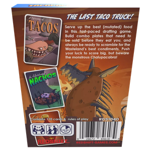 Serve up the best (mutated) foods in the fast-paced drafting game Tacopocalypse. Build combo plates that need to be sold before they eat you, and always be ready to scramble for the Wasteland's best condiments. Push your luck to score big, but beware the monstrous Chalupacabra!