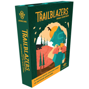 In Trailblazers, players compete to earn the most points by building biking, hiking, and kayaking loops from their campsites of the matching trail type. Each round, players are dealt eight trail cards where they’ll draft two cards, arrange those cards in their personal area, and pass their hand to the next player three times. Cards must either be placed adjacent to or overlapping other cards. While players can push their luck by aiming to construct long and elaborate trails, only closed loops that start and end at a matching campsite will score points. Players also compete to fulfill “First To” and “End Game” goal cards. After four rounds, the game ends and the player with the most points from closed loops and goal cards wins.