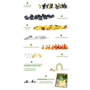 Standard Kickstarterutgåva av Zoo Tycoon: The Board Game med stretchgoals och Kickstarterexklusiva Giant Pandas. Läs mer på Kickstarterkampanjen för exakt innehåll och senaste nytt om leveransdatum.