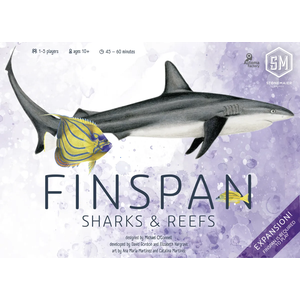 Finspan: Sharks & Reefs tar grundspelet till nya djup med ett spännande fokus på hajar och de färgstarka fiskar som lever bland korallreven. Denna expansion introducerar helt nya korallrevshabitat till din spelplan och ännu fler magnifika hajar med nya förmågor!