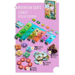 Mountain Goats: Legacy är ett snabbspelat tärningsspel med legacy-kampanj, där varje kapitel låser upp nya regler, förmågor och överraskningar. Spelet bygger på ett lättillgängligt “roll & move”-upplägg: du slår och kombinerar tärningar för att klättra uppför olika bergsspår och försöka nå toppen för att ta poäng, men du riskerar också att bli nedknuffad av andra getter.