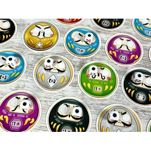 In the game, the players take turns throwing 8 dice. And they should use '1' to fill the eyes of the darumas that are available over the game board. When a player fills an eye of a Daruma, execute the power of this card, giving the possibility to perform crazy combos for obtaining more darumas. If a player fills the second eye, the player receives the card to score at the end of the game.