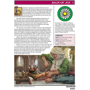 In addition to covering the order's history, present situation, scriptures, and lore, the article details how one joins and lives in the order. Also included are descriptions of three specialist subgroups in the order: the midwives in the Daughters of St. Eaclid, the missionaries of the Shepherdesses of Valon, and the Sisters of Deliverance, also known as the Merciful Sisters, who are dedicated to the care of the dead and dying.