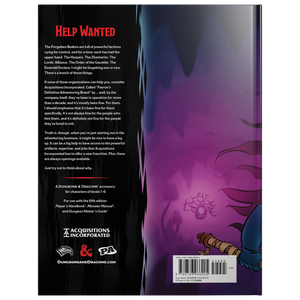 Everything a player needs to live out their fantasy of climbing the corporate ladder of the most notorious retrieval agency in the Forgotten Realms —Acquisitions Incorporated. An adventure that will take characters from levels 1 through 6, establishing the party's claim on a world they've just begun to explore—and to strip-mine for profit.