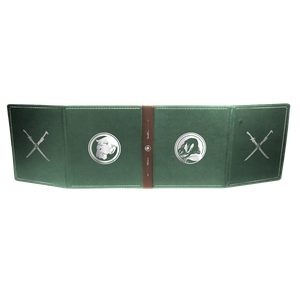 In need of some Greater Invisibility at the game table? Let all your DM decision making Pass Without Trace behind the privacy of the Premium Dungeon Master’s Screen for Dungeons & Dragons inspired by Drizzt and the Forgotten Realms! This premium leatherette tri-fold screen offers everything you need to run your campaign, and provides the perfect protection for hiding dice rolls, quick damage calculations, and upcoming ambushes from the rest of your team’s prying eyes. Each of the four clear, write-on pockets on the inside of the screen is gusseted and holds up to 10 8.5” x 11” sized paper sheets, which can also be held in place outside the pockets with the 8 included initiative tracker clips. Use the clear plastic sheet of each pocket as a wet/dry-erase surface for tracking map movements, initiative order, or shop inventory lists with the included dry-erase marker! This officially licensed screen features a Sage Green and Brown pebbled leatherette exterior and soft light grey suede interior featuring an original map by Deven Rue of the Forgotten Realms with silver metal and foil accents, and sits perfectly flush on the shelf next to your other Ultra PRO Premium Source Book Covers. Includes four unique pages of static-cling reusable stickers to quickly build NPCs and dungeons, place enemies, and track status conditions. Measures approximately 42.77” lengthwise when fully opened, with a height of 11.79”.