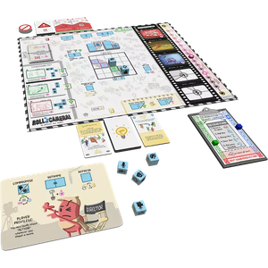 Place the Crew in specific arrangements matching those on the Shot cards, resolve the constant Problems getting in your way, and hold production meetings to play Idea cards from your hand to help out. Everything costs time and money, and you lose if either one runs out. You must also ensure your film reaches a certain level of Quality in order to win!