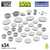 Innehåller 34 delar: tallrikar, skålar, serveringskärl och köksredskap