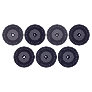 Clearly define the 3-inch scoring zone in your Warhammer 40,000 games. This complete set of 7 non-slip 'mousepad' material objective markers (numbered 1-6 & X) eliminates arguments and speeds up play.
